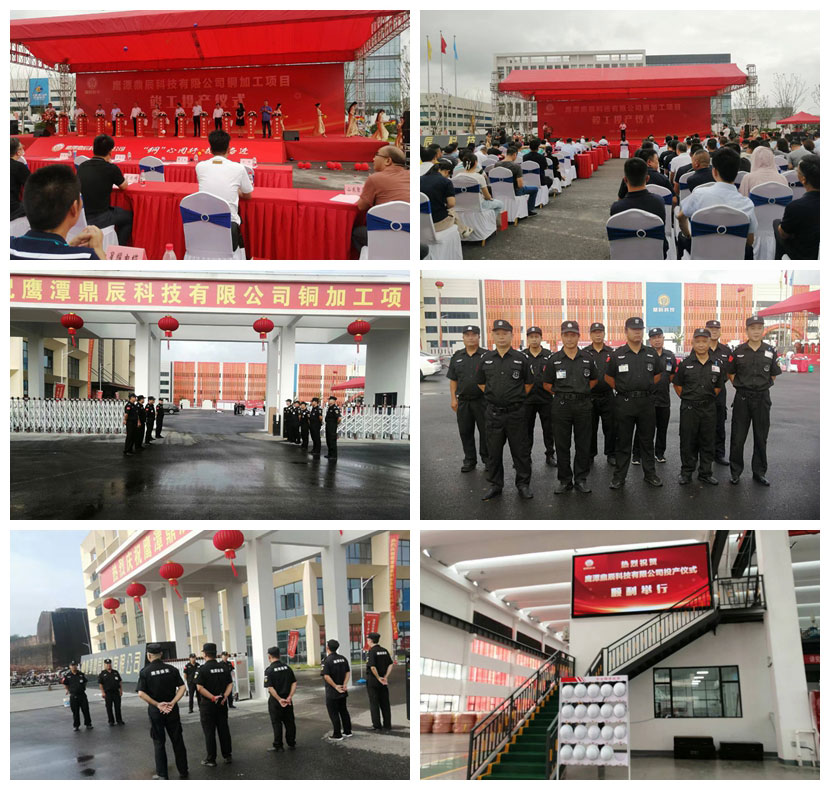 9月16日上午,鹰潭鼎辰科技有限公司铜加工项目竣工投产仪式在江西省鹰潭市高新区同心路举行,鹰潭市副市长余红艳、高新区管委会书记周谷昌、中辰股份董事长杜南平、总裁姜一鑫、市发改委、工信局、商务局、科技局、环保局、市场监管局、税务局、供电公司及来自全国各地192名嘉宾和100余家企业参加。鹰潭市保安服务有限公司抽调16名精兵强将,赶赴现场,承担此次竣工投产仪式安保任务。