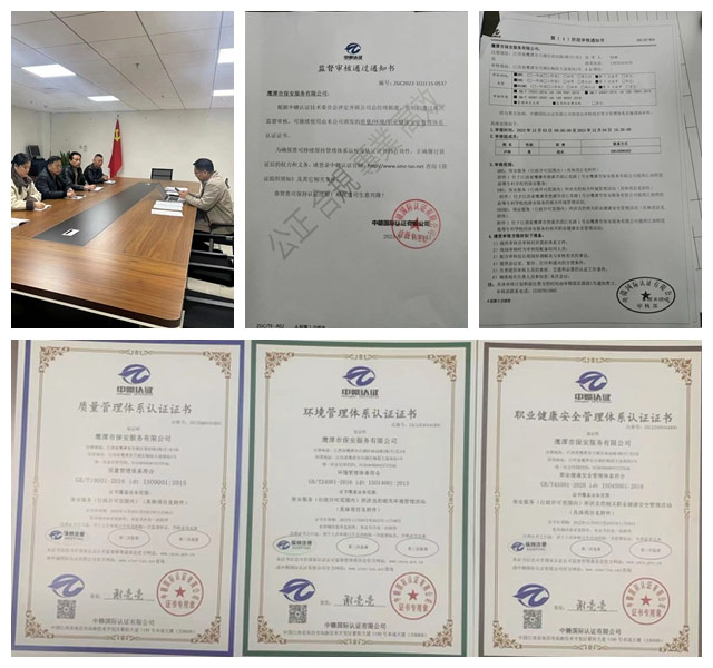 近日,中国国家认证认可监督管理委员会批准的第三方审核机构中赣国际认证有限公司(ICAS)派出工作组,对鹰潭市保安服务有限公司进行GB/T ISO9001:2016质量管理体系、GB/T ISO24001:2018环境体系、GB/T ISO45001:2020职业健康安全管理体系认证年度审核,经过工作组卢伟组长为代表的专家认真审核:我公司各项审核项目均达到了国家质量、环境和职业健康安全管理体系规定标准,顺利通过此次质量管理体系年审。(3年换一次证,3年内每年进行审查,2023年为第一年度审查),证书有效期为三年,生效日期为2022年11月9日,到期日为2025年11月8日。